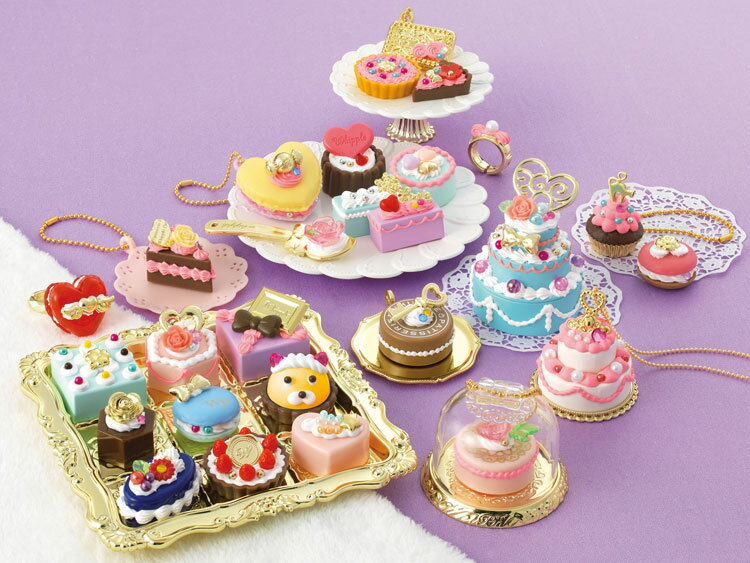 スイーツをかわいく演出する、ケーキドーム型ネックレスや、たくさん飾れるセレクショントレイ、ゴージャスなケーキスタンドもついて、飾っても素敵なセットです。